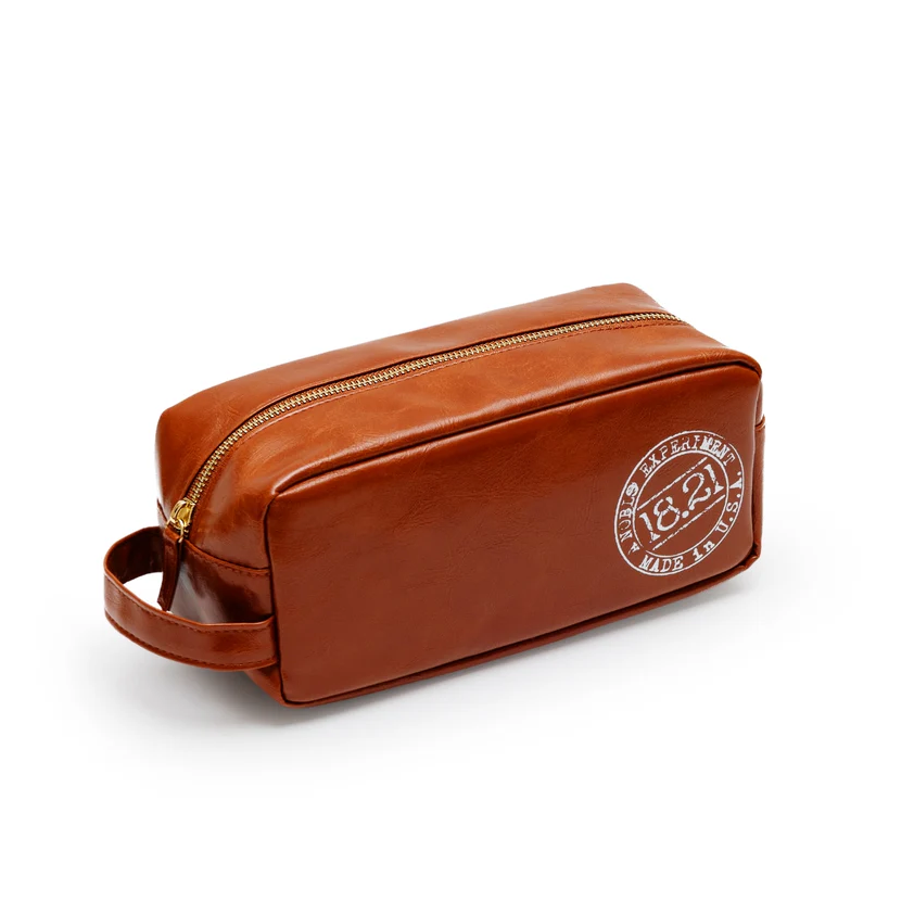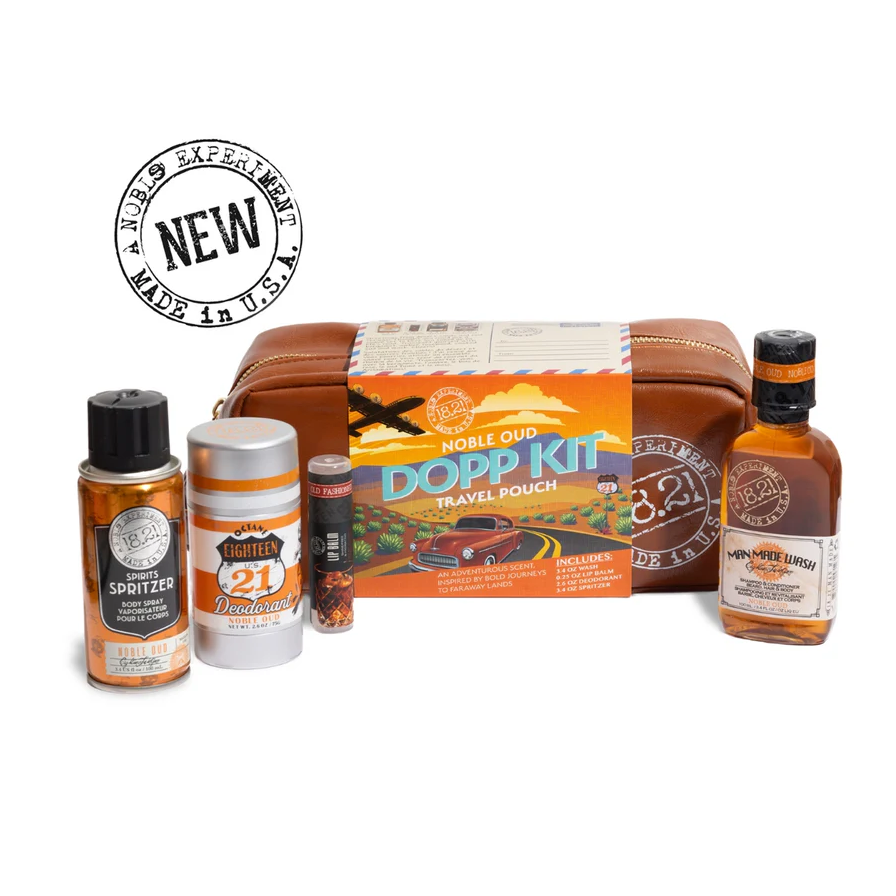 Unleash the spirit of a bygone era with our 18.21 Man Made™ Men’s Grooming Dopp Kit, a stylish and discreet collection of essentials for the distinguished traveler. Encased in a handsome leather pouch, this vintage-inspired set includes a Man Made Wash, Lip Balm, Deodorant, and Spirit Spritzer body spray, ensuring you’re polished and ready for any adventure.