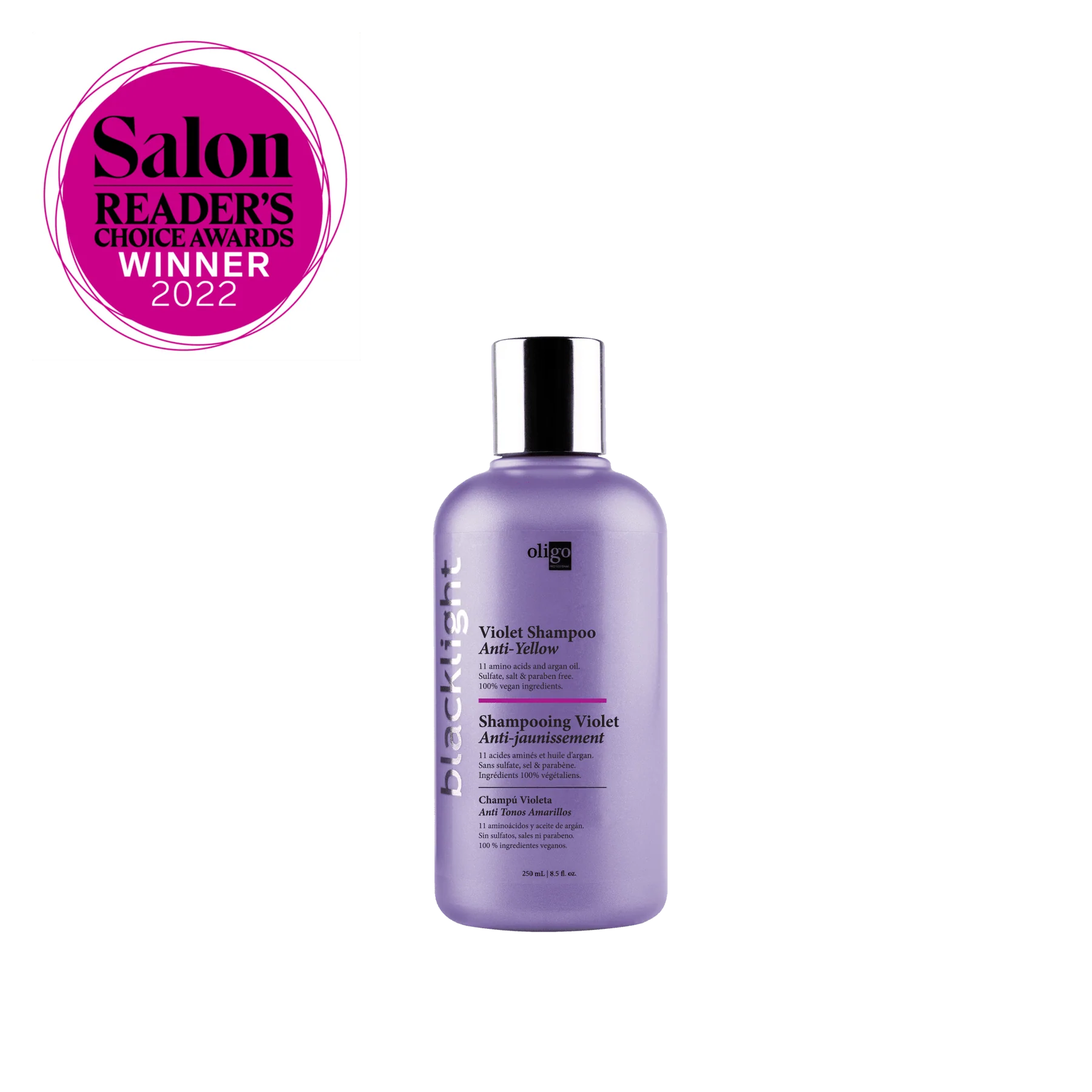 Blacklight’s Violet Shampoo, formulated for highlighted, bleached, white and natural blonde hair, eliminates yellow tones, brassiness and refreshes faded highlights leaving hair looking cleaner and brighter. Its unique formula, enriched with 11 amino acids and argan oil, moisturizes, strengthens hair structure and repairs surface damage while increasing shine and colour retention. Sulfate, salt and paraben free.
