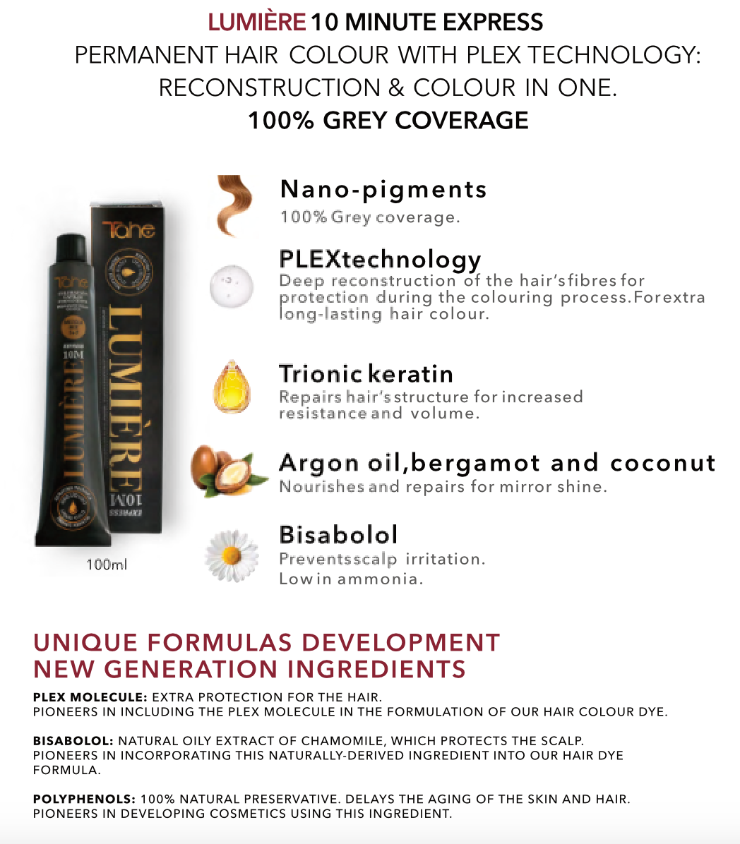 Tahe Lumiere Express is the perfect solution for those looking for fast and effective colouring that also takes care of the condition of the hair. Choose this product to enjoy beautiful, long-lasting colour and healthy, shiny hair. Don't wait, discover the difference today!